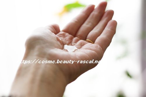 手に中身を出してみると、無色透明のカラーで、若干とろみがあるものの水のようなパシャ系のテクスチャーです。